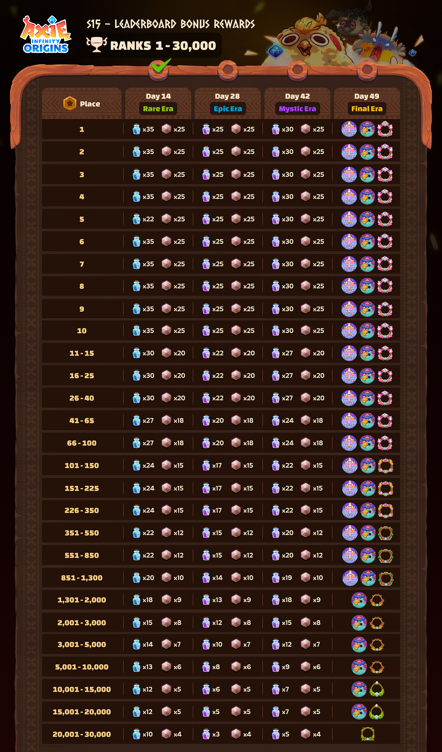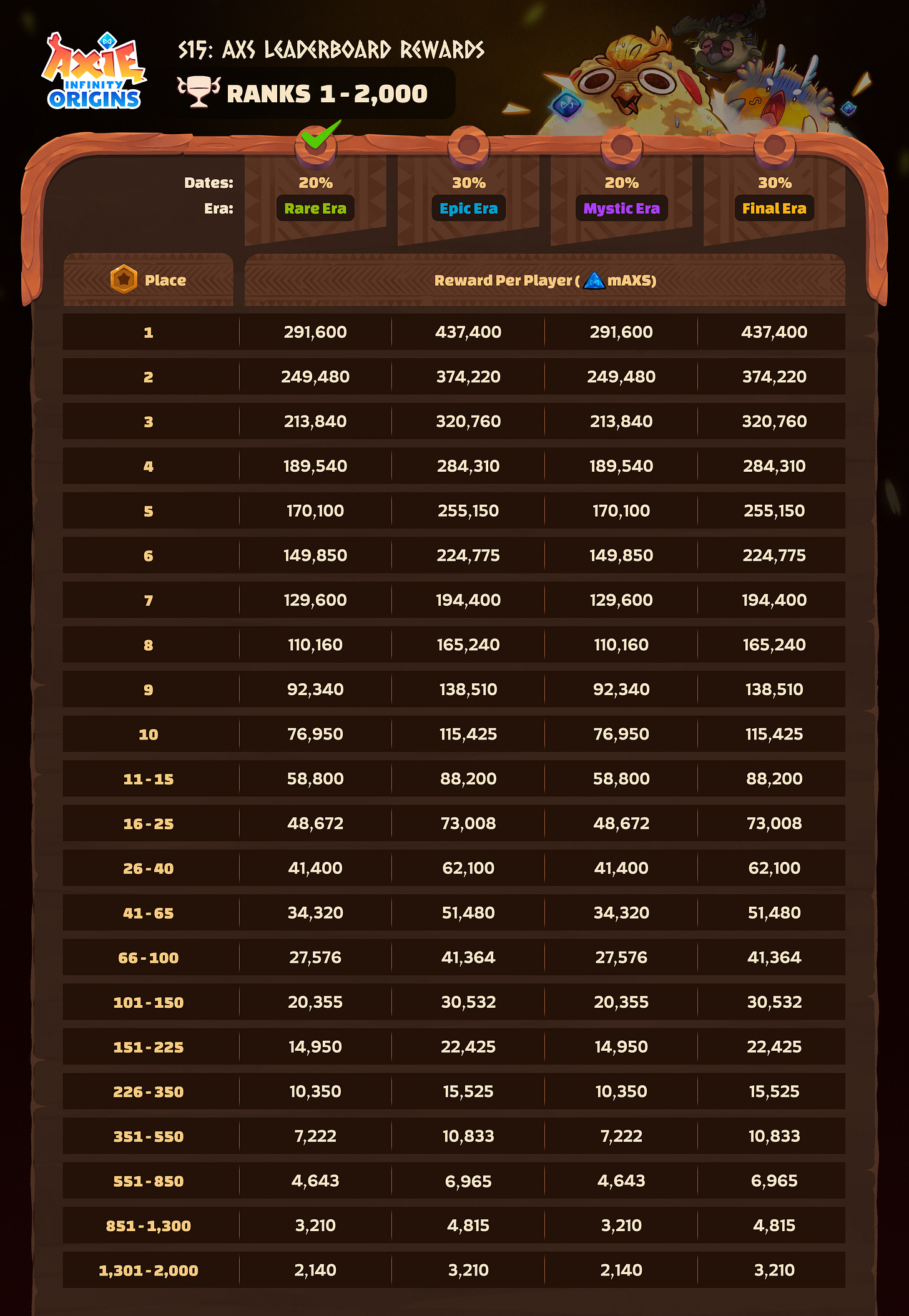 The Top 2,000 players in S15 will share an 80K AXS prize pool. There’s 20K AXS on the line in the Rare Era, as well as a variety of bonus rewards.
