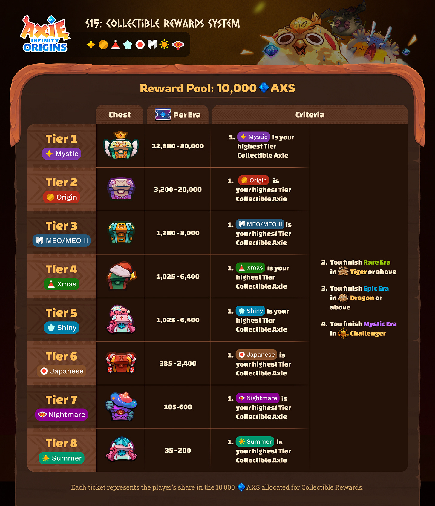 The Collectible Chest reward pool has a whopping 10,000 AXS up for grabs this season! Remember: You’ll need to finish the Rare Era at a rank of Tiger or higher while holding your collectible axie throughout the entire era to earn Collectible Chests. Open your Chests to reveal Tickets, and redeem your Tickets for AXS rewards.