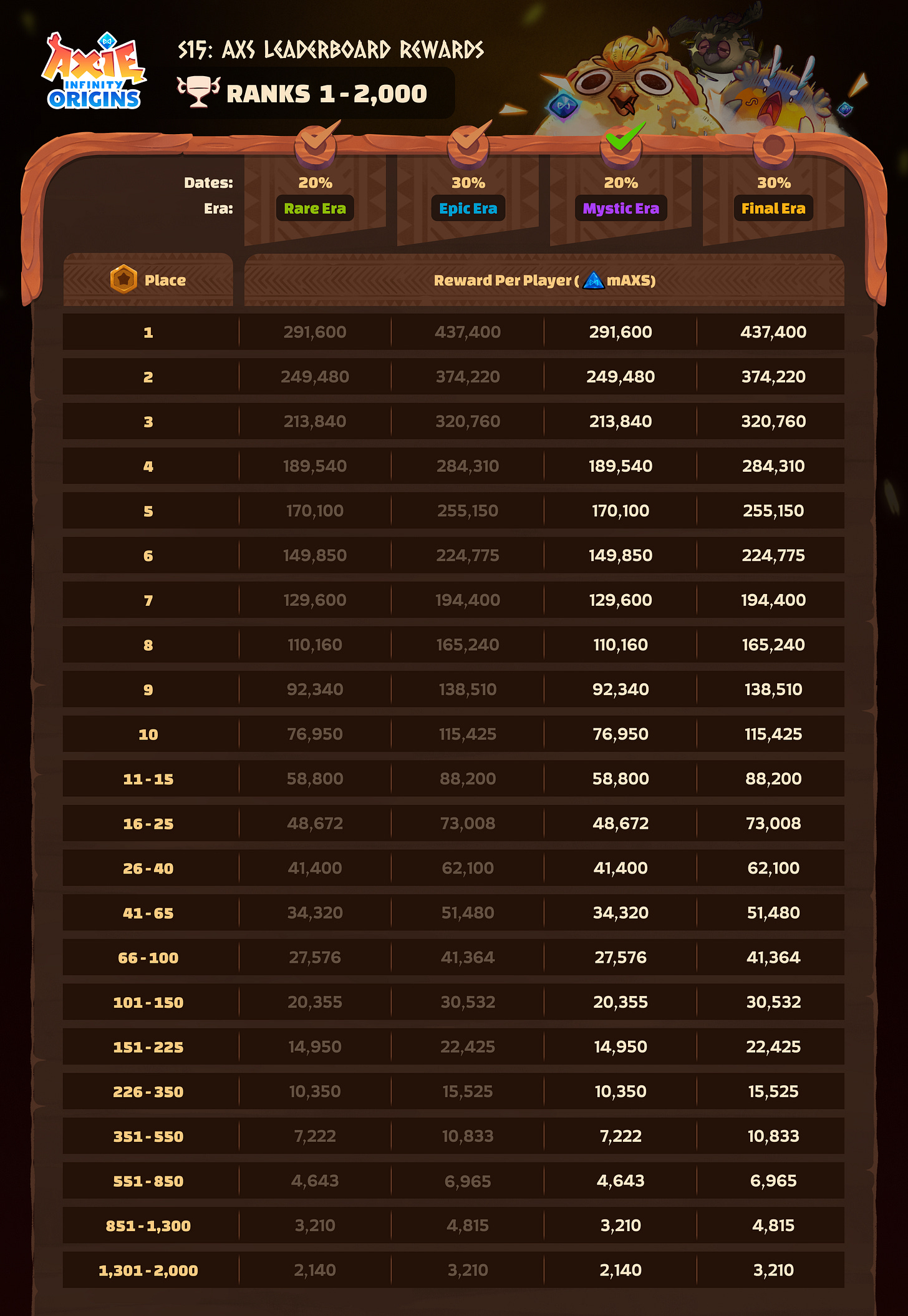 Origins S14 Mystic Era is LIVE! Jump into the arena for over 14K AXS and bonus rewards. Congrats to LVM | Vitin for climbing to the top during the Epic Era! Who will finish at the top this era? Let’s find out in the arena: