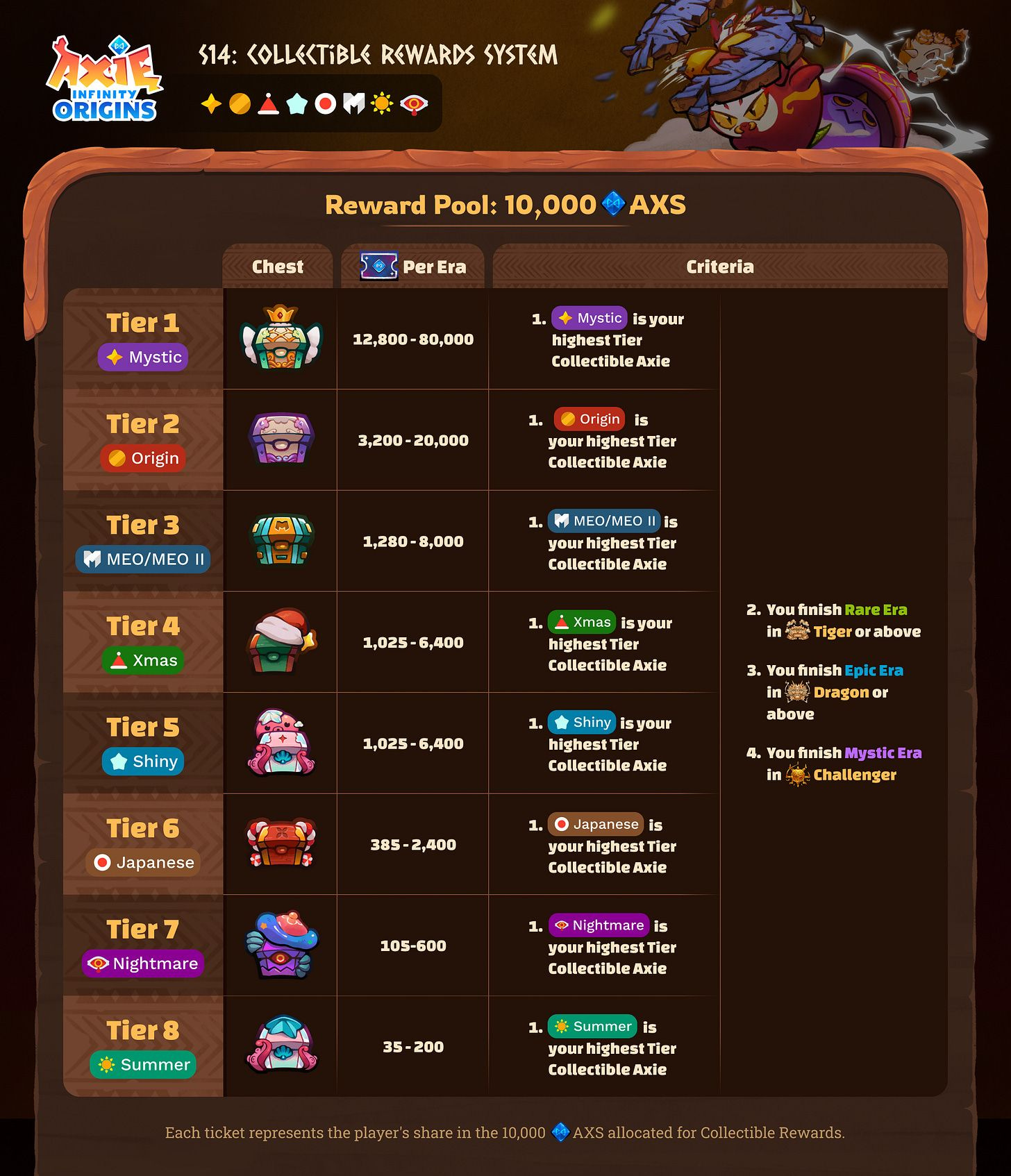 Collectible Chests are loaded with Tickets redeemable for AXS rewards. To get some, finish the Mystic Era at a rank of Challenger while holding your collectible axie throughout the entire era. This is one of the many perks available for collectible axie holders.